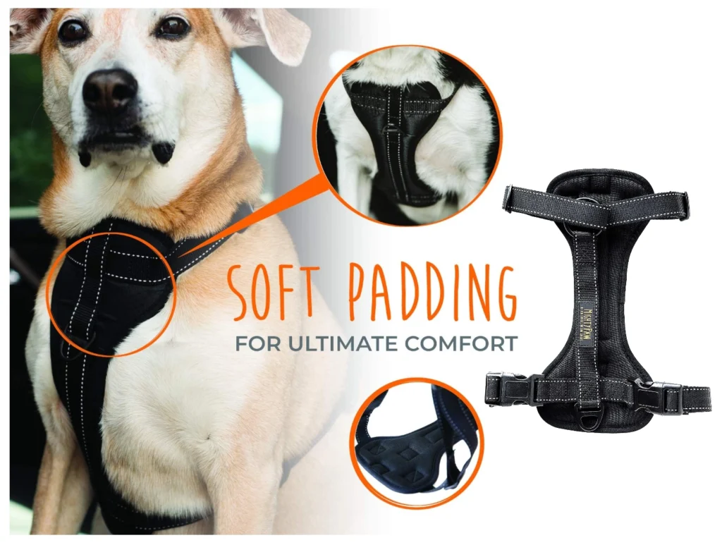 The harness features a fully padded construction with a breathable mesh liner that ensures comfort during long trips. A soft fleece layer gently cushions your dog’s body, allowing them to relax with ease. The design includes three attachment points using the headrest strap, the lower seat strap, and the seat belt loops, which provide excellent stability for dogs that are prone to motion sickness or anxiety.